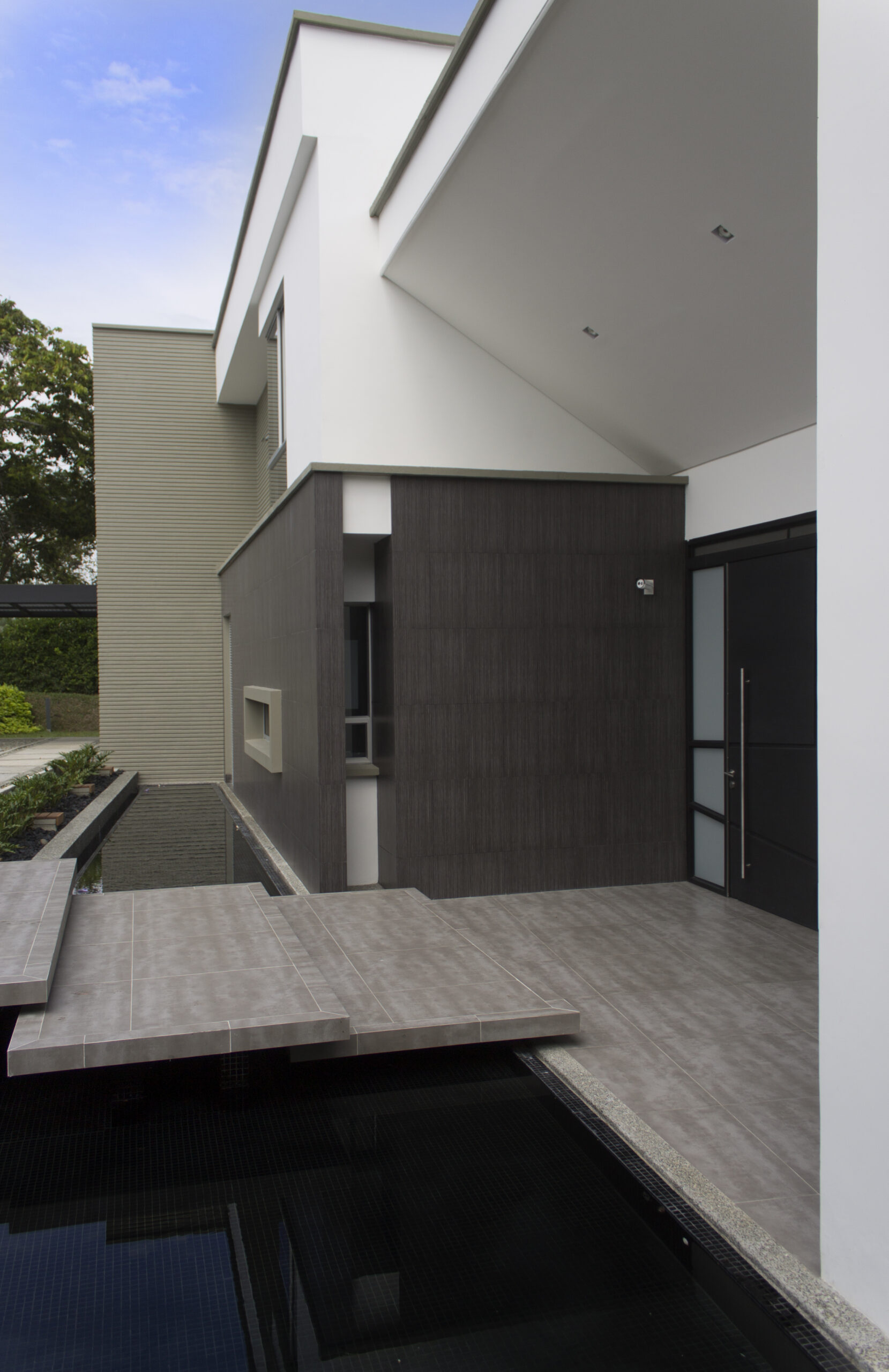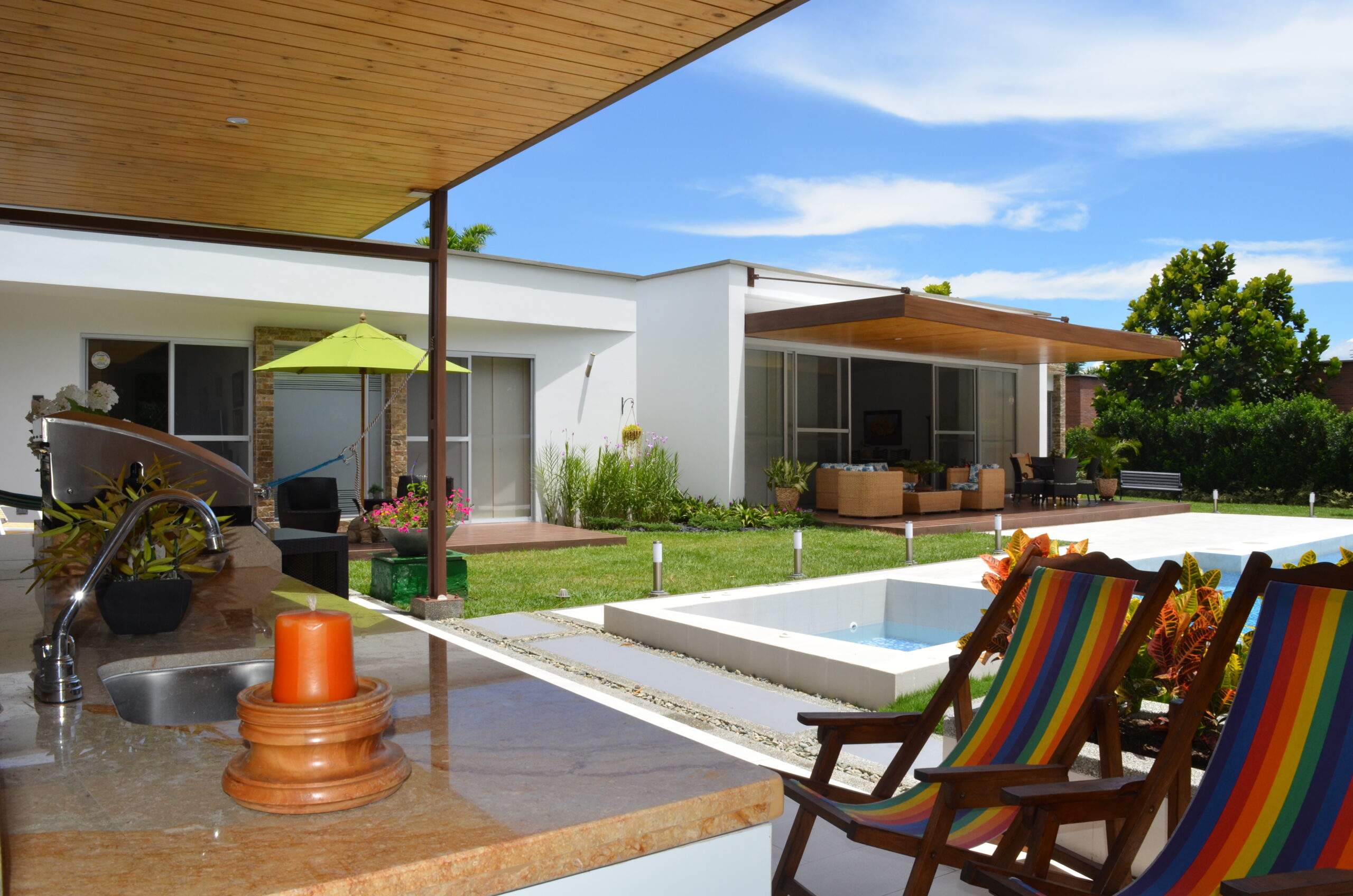Esta casa de estilo contemporáneo, tiene una composición volumétrica limpia y pura, con acabados de fachada en piedra beige cortada en piezas de 6 cms de ancho por junta perdida y fusionada con muros blancos. La vivienda se abre hacia la vista interior que da sobre un guadual propio del paisaje de la región cafetera.